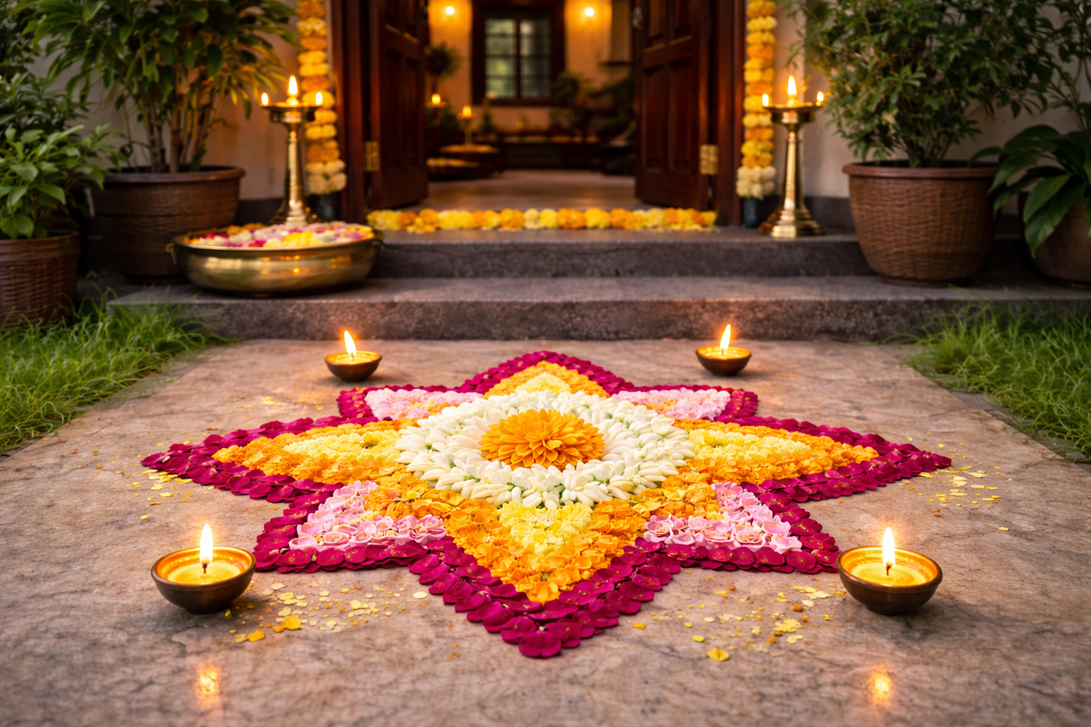 A simple circular pookalam near the main door creates a welcoming vibe.