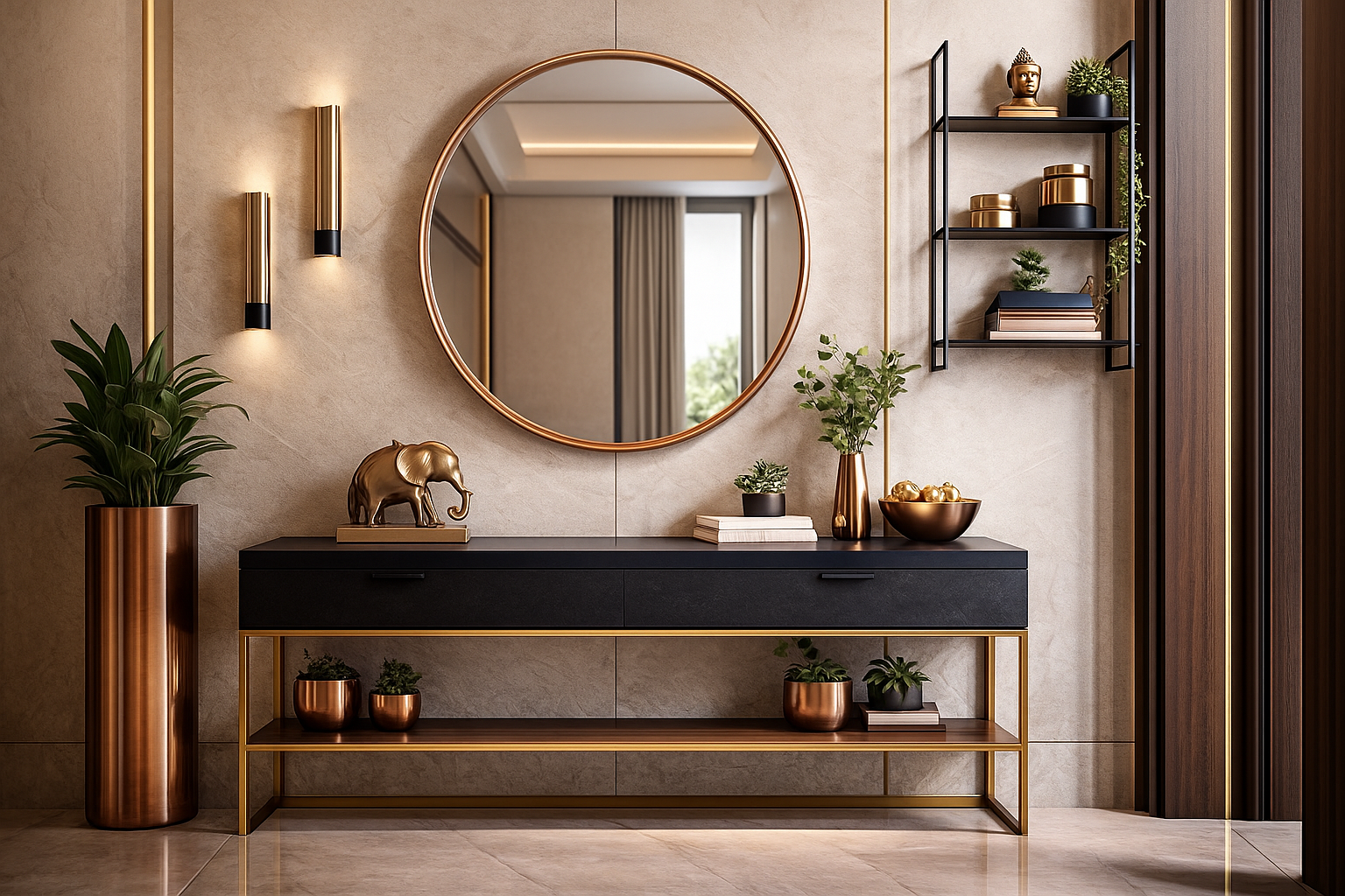 The console table is the heart of many modern Indian entrances. When styled right, it transforms the wall into a beautifully curated space.