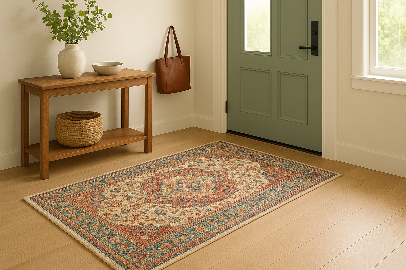 Warm-toned light wood floors pair beautifully with warm rugs (taupe, beige, sand).