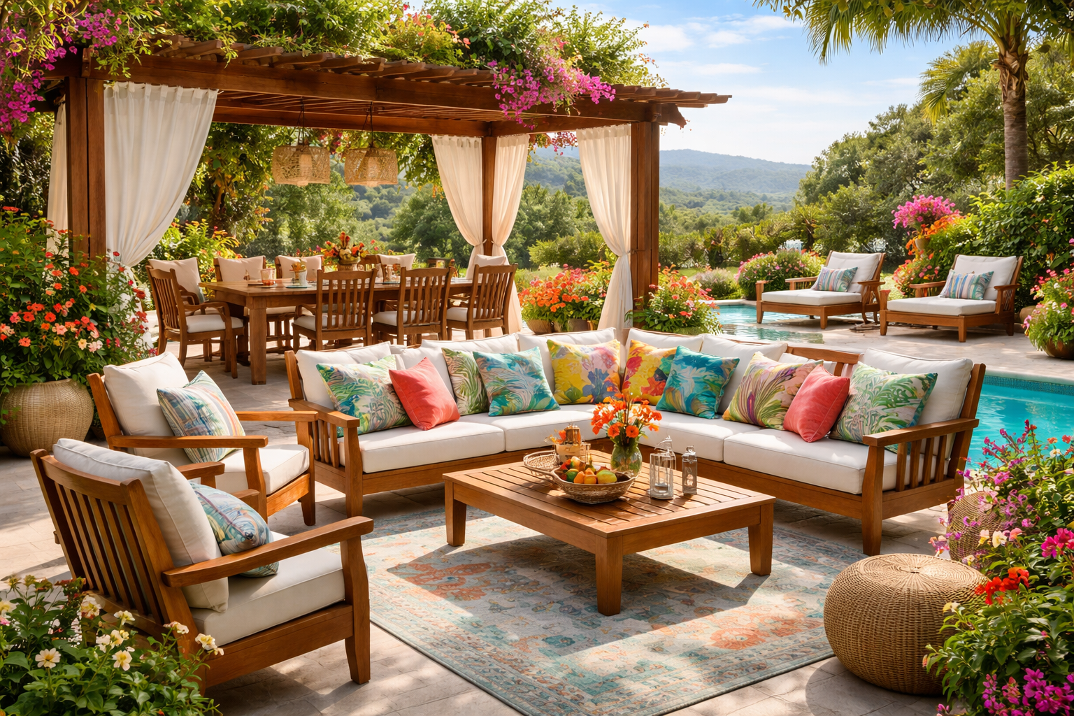 The combination of wooden frames with soft cushions creates a balance between luxury and relaxation, ideal for long afternoons outdoors.